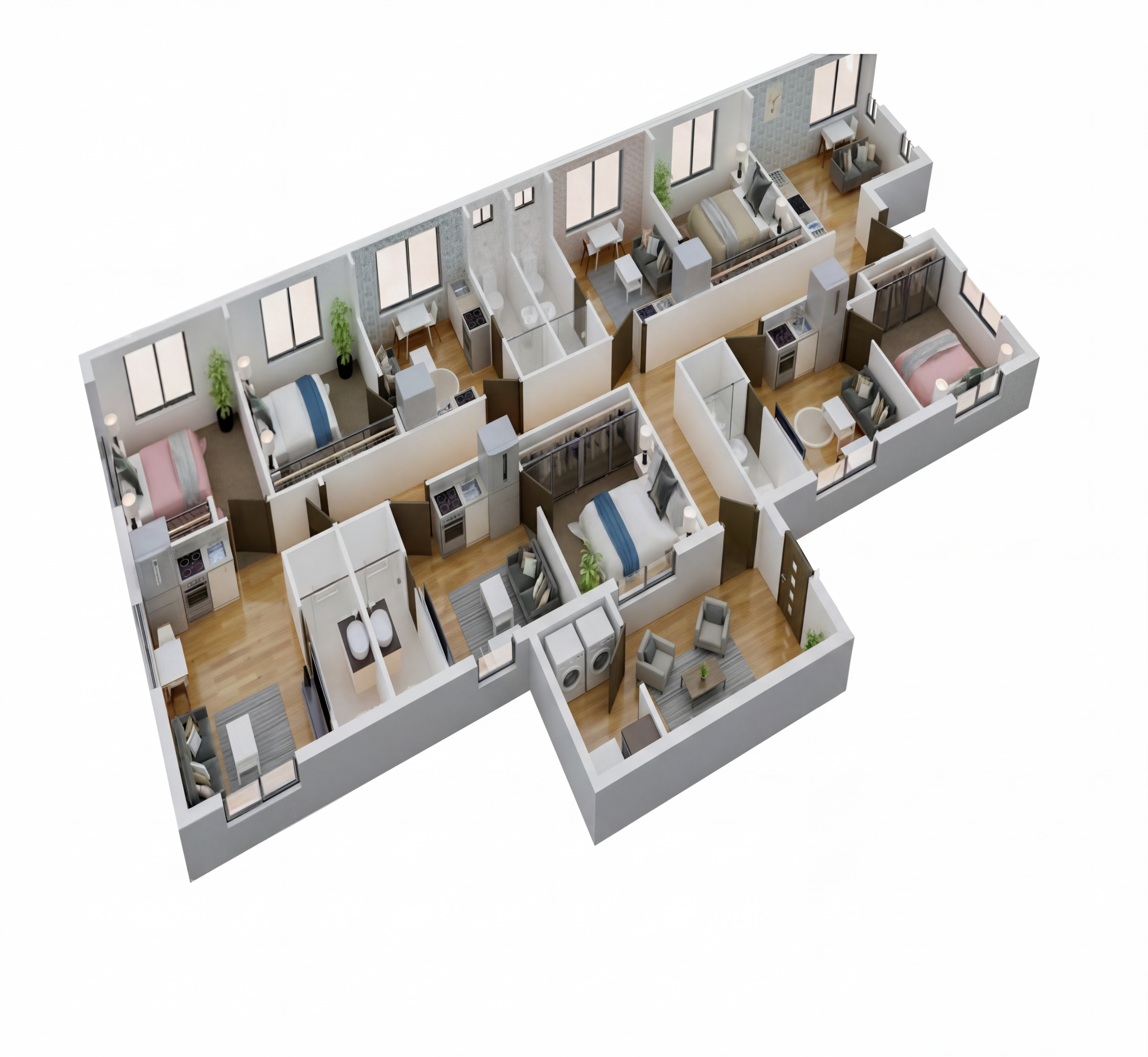 Through internal reconfiguration and a compliant multi-room rental structure, More Rent converts underutilised space into multiple independently leased rooms — without extending the property's footprint. Each room becomes a separate income stream, compounding overall yield within the existing asset.